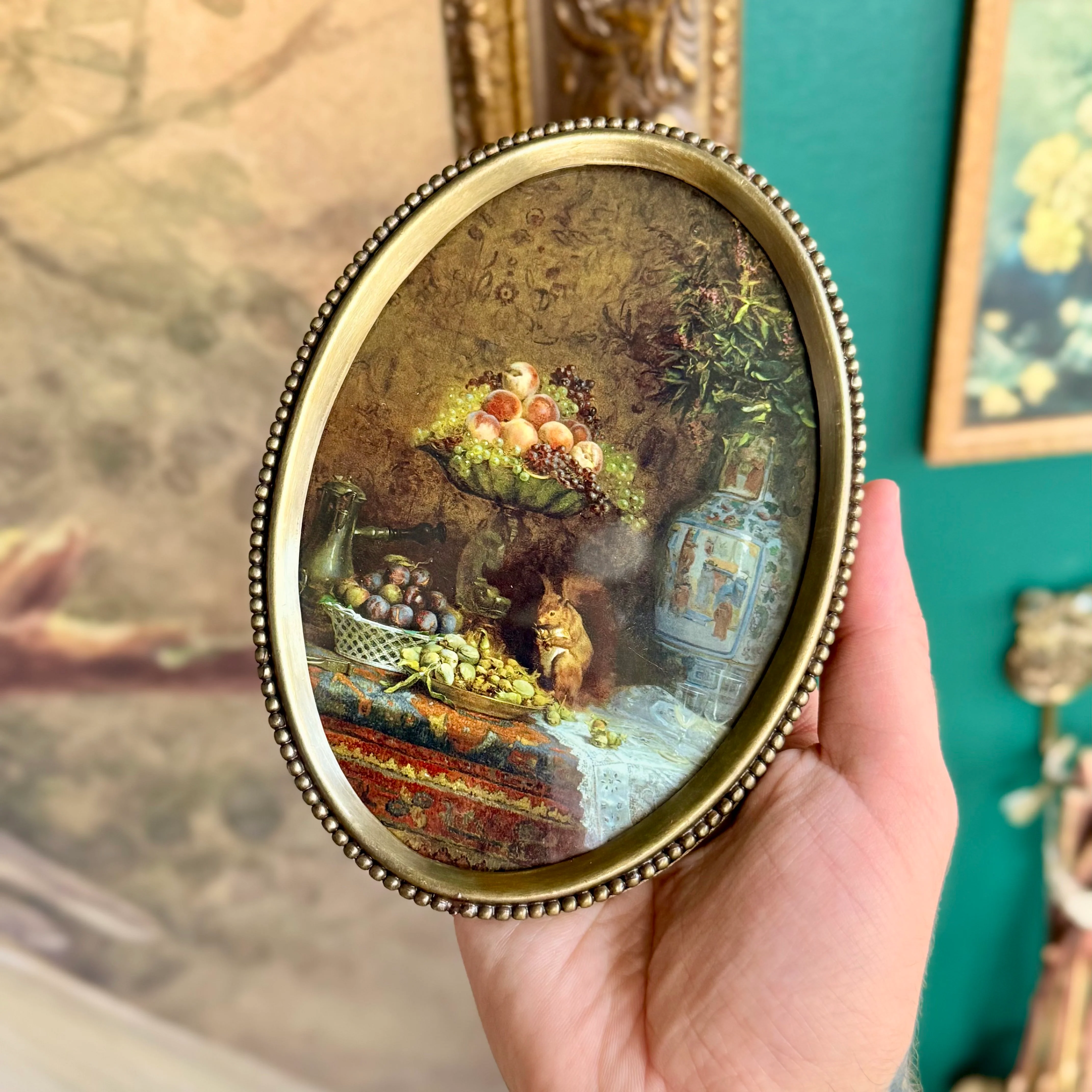 Introduce old-world charm into your space with our Mystic Harvest Still Life, a captivating reproduction of a French still life oil painting. Featuring a delicately detailed composition of a vase, ripe fruit, and a curious squirrel, this piece exudes the rich elegance of centuries past. Nestled behind glass in an antiqued beaded brass frame, its intricate details and warm, muted tones create an aura of Victorian mystique—perfect for those who adore historical décor with a touch of enchantment. Whether displayed alone or as part of a curated gallery wall, this petite masterpiece adds a refined, witchy elegance to any room.