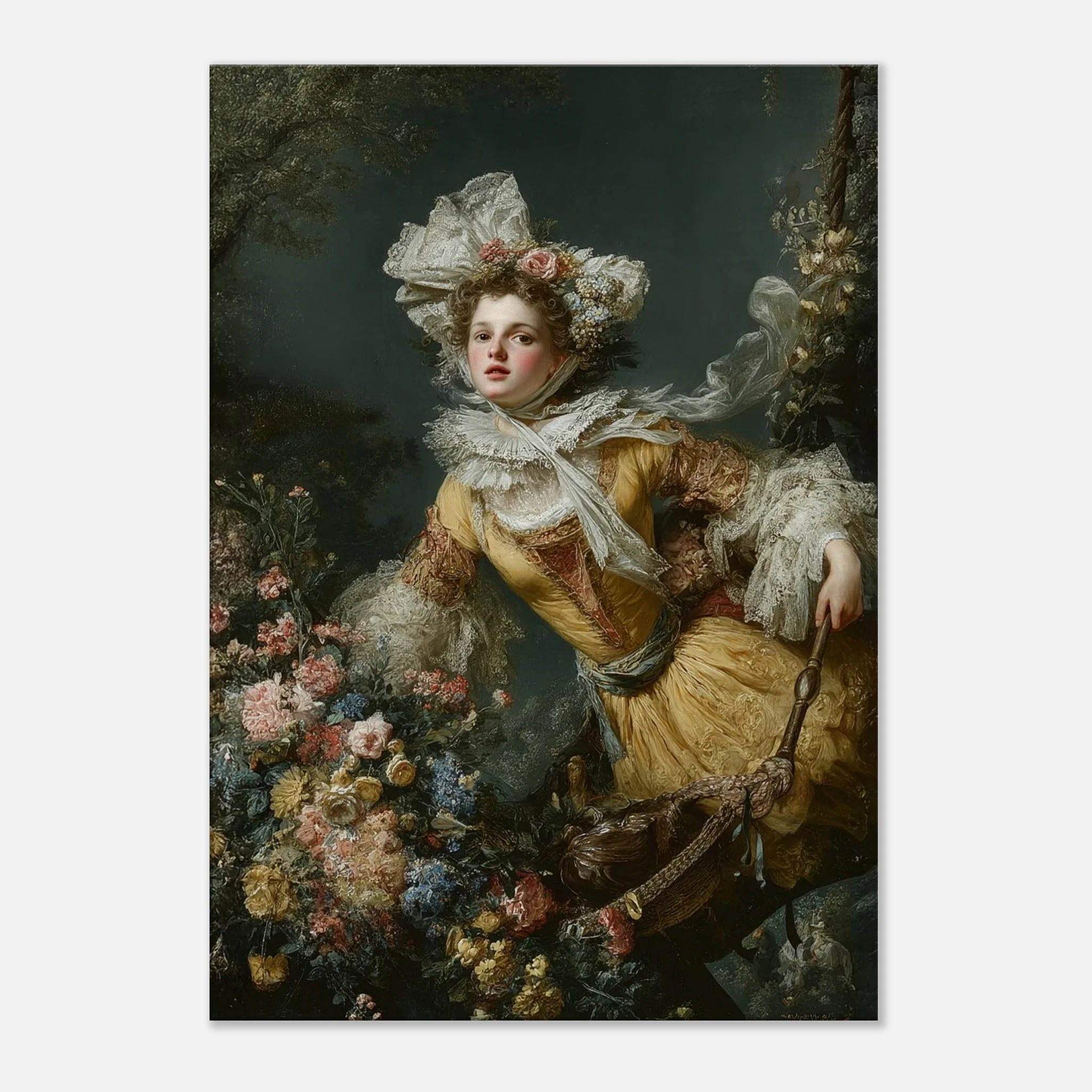 Bathed in blossoms and lifted by the lightness of spring, The Floral Swing sweeps you into a world where joy is effortless and beauty feels suspended in time. Her rosy cheeks, wind-touched curls, and gown of gilded silk echo the charm of Rococo romance—playful, tender, and breathlessly alive. Surrounded by lush bouquets and drifting lace, she becomes a vision of youth, wonder, and the fleeting magic of a moment caught mid-flight.